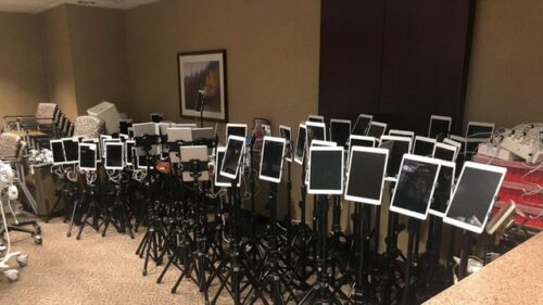 Bức ảnh chụp những chiếc máy tính bảng treo xếp kín một góc bệnh viện ...